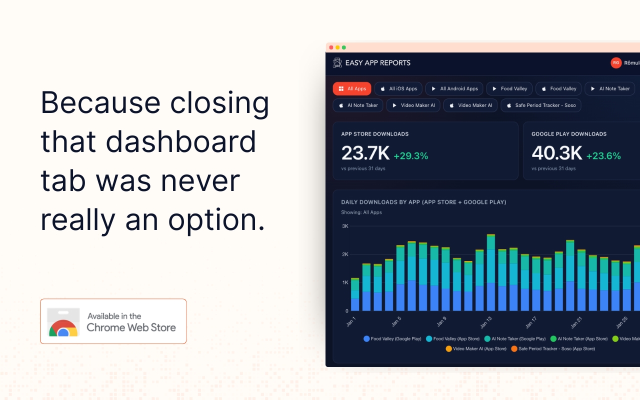 AppTab is a Chrome extension that surfaces your App Store and Play Store data directly in Chrome's new tab page.